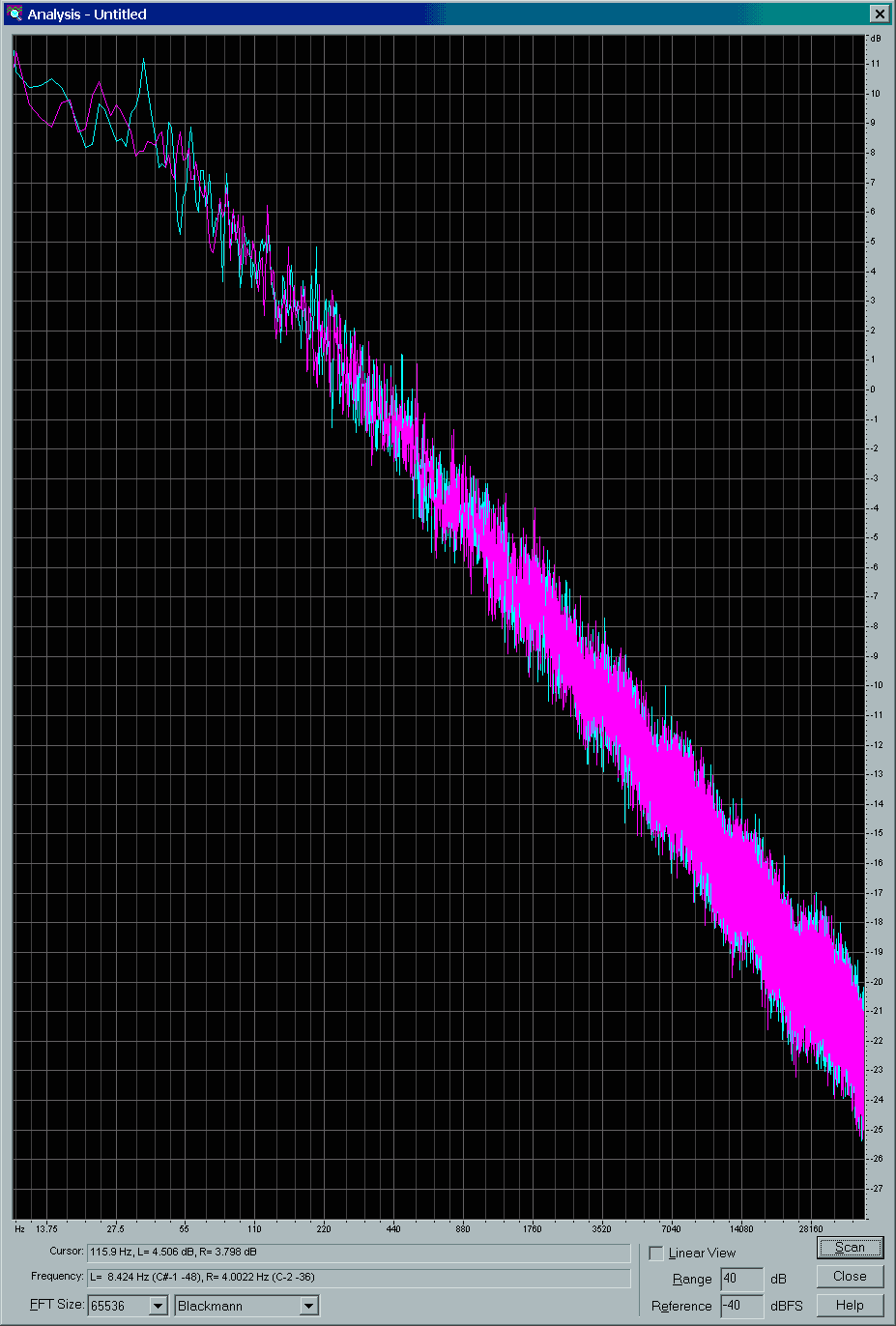 Audio was generated from a WAV file editor, then recorded at its destination. An FFT was done on each. Clicking on any of the following links will download zip files containing the full resolution Windows Bitmap (BMP) images.